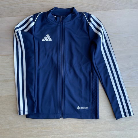 Adidas verkkariasu lapsille, koko 128 (7–8 v). Asuun kuuluu vetoketjullinen takki ja pitkät housut. Väri musta punaisilla sivuraidoilla ja kullanvärisillä kruunu- ja Adidas-logoilla. Materiaali on sileää, urheiluun sopivaa tekokuitua. Sopii esimerkiksi arkeen ja erilaiseen liikuntaan lapsille, joiden pituus on noin 128 cm.