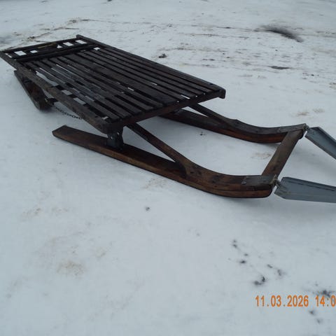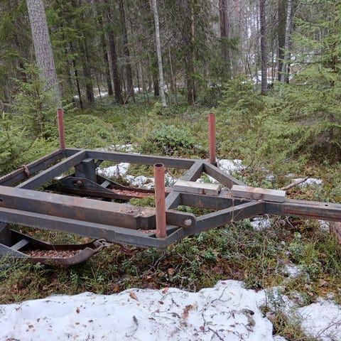 Traktorin perään rautainen reki puunajoon. Voi käyttää muuhunkin kuskaamiseen, pankot irroitettavat.