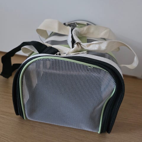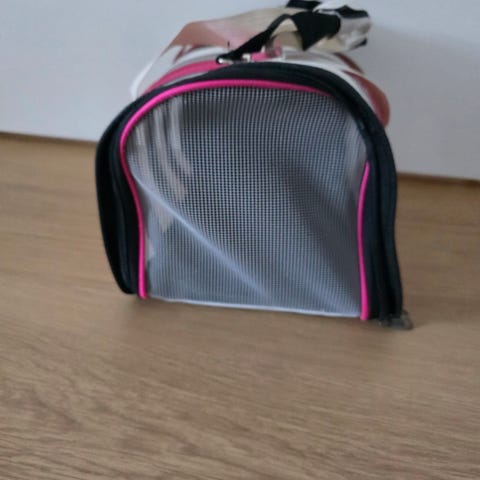 Lemmikin kuljetuslaukku pienille eläimille, kuten kissoille. Laukussa on pinkki ja harmaa kangaspinta sekä verkkopaneelit, jotka parantavat ilmanvaihtoa ja mahdollistavat näkyvyyden. Laukussa on kantokahva ja säädettävä olkahihna.