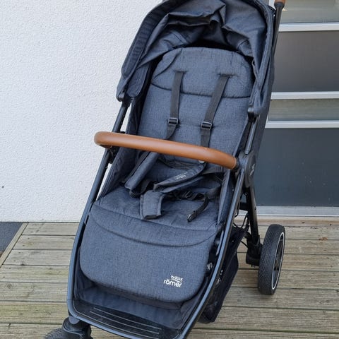 Britax lastenrattaat/matkarattaat harmaansinertävällä kankaalla ja ruskeilla keinonahkayksityiskohdilla.
