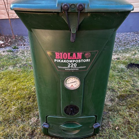 Vihreä Biolan puutarhakompostori. Mitat leveys 130 cm, syvyys 82 cm, korkeus 68 cm kannen alaosaan ja 75 cm kannen yläosaan. Arvioni tilavuudeksi on 500-600 l. Tarkkaa tietoa tilavuudesta minulla ei ole. Kansi hivenen taipunut, mutta edelleen tiivis. Nouto.