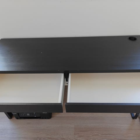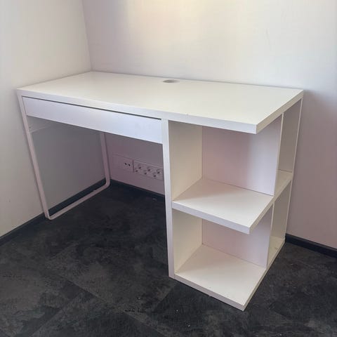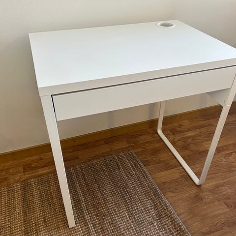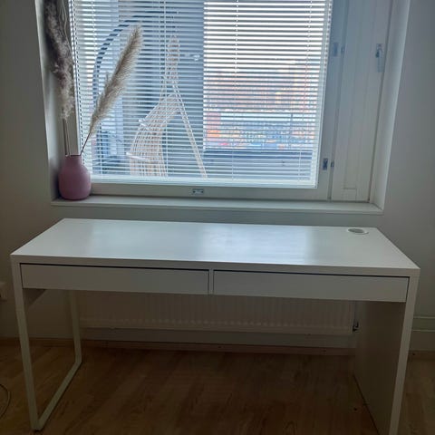 Ikea Micke työpöytä kahdella vetolaatikolla. Pöydän pinnassa pientä kulumaa ja laatikoiden sisäpuolella tahraa sekä kupruilua. Ollut teinillä käytössä tietokone ja meikkaus pöytänä. Koko on 142x50cm ja tarkemmat tiedot halutessaan löytyy ikean nettisivuilta. En puhdistanut pöytää ennen kuvia joten varmuutta tahrojen lähdöstä ei ole eli katso kaikki kuvat ennen ostopäätöstä!!