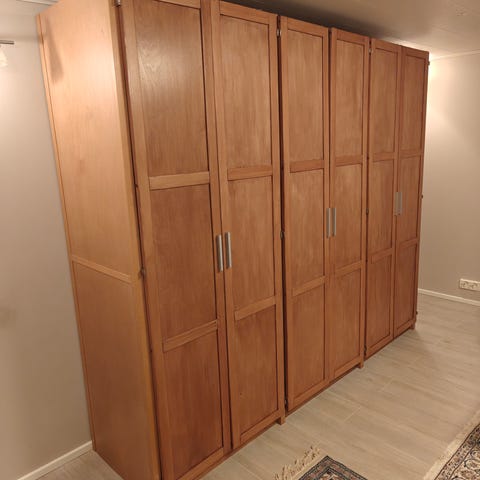 Oikean puoleisessa kaapissa on viisi hyllytasoa + pohjalevy. Vasemman puoleisessa on yksi hyllylevy + pohjalevy sekä kiinnikkeet vaatetangolle, mutta itse tanko puuttuu. Kaappi on mahdollisesti Classic-sarjaa.
