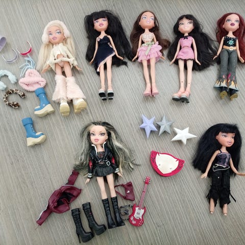 Kuvan Bratz nuket Cloe, Roxxi ja Yasmin yhteensä 60 euroa. Keskimmäisellä Winter Girlz Roxxilla on alkuperäiset vaatteet. Yasminin pusero ei ole alunperin bratz nuken, muut vaatteet ja kengät on.