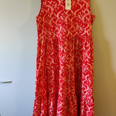 Ivana Helsinki Nordic Tricot mekko naisille. Koko L (noin 44/46). Materiaalina puuvilla. Mekossa on monivärinen, kirjavapintainen kuosi, jossa on lintukuvioita tummalla pohjalla. Malli on väljä ja polven tuntumaan ulottuva, ja siinä on pitkähköt hihat sekä taskut. Sopii arki- ja vapaa-ajan käyttöön. Hyvässä kunnossa, värit hyvin pysyneet, ei nukkaa eikä likatahroja.