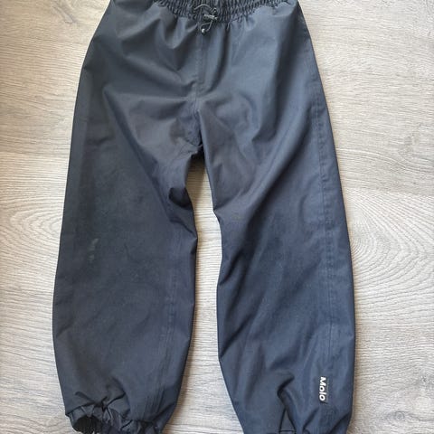 Molo lasten housut, koko 116. Väri sininen. Materiaali polyesteriä, sisäpuolella verkkovuori. Vyötäröllä joustoresori ja kiristysnyöri. Lahkeensuissa kuminauhat. Takalahkeissa heijastintähdet. Unisex-malli. Polvissa hieman pehmentymää ja pienet tahrat (näkyy kuvissa). Muuten siistit.