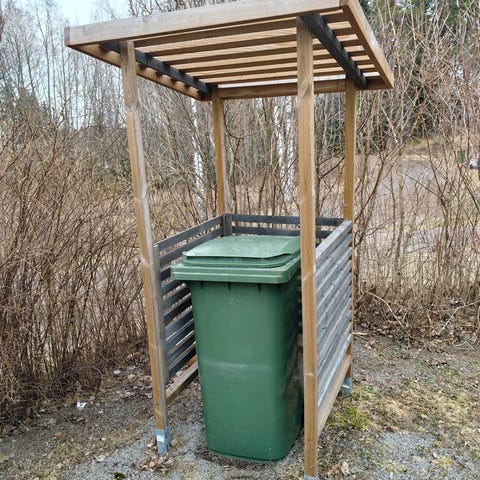 Metallirunkoinen musta jätekatos ulkokäyttöön. Kolmen seinää ja kattorunko kuuluu hintaan. Ostaja vastaa irroittamisesta ja kuljettamisesta.