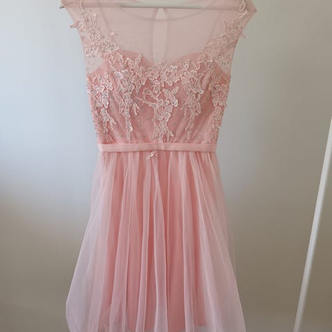 Ollut päällä yksissä rippijuhlissa, ei käytönjälkiä. Laput leikattu irti, mutta vastaa S kokoa. Mekon kokoa pystyy myös säätämään nyörien avulla. Kaksikerroksinen helma. Helman pituus 48cm.