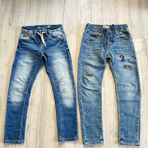 Reserved lasten farkut, koko 134. Siniset denim-housut, unisex-malli. Perinteinen viisitaskuinen farkkumalli, vyölenkit vyötäröllä ja nappi–vetoketjukiinnitys edessä. Sopivat arkipukeutumiseen sekä tytöille että pojille.