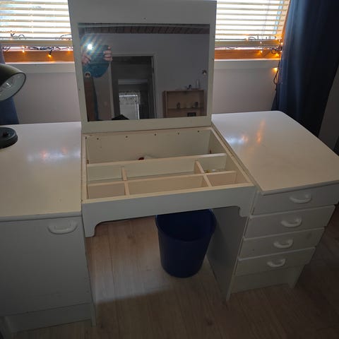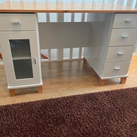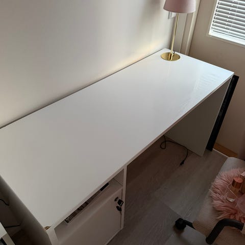 Ikeasta ostettu pöytä, koottu itse jalat+kansi sopivaksi. Siro rakenne ja neutraalit värit.