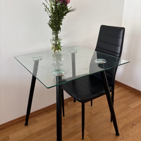 Lasinen ruokapöytä, jossa neliönmuotoinen kirkas lasikansi ja neljä mustaa metallijalkaa. Kansi on kiinnitetty metallisilla kiinnikkeillä jalkoihin. Sopii esimerkiksi pieneen keittiöön tai ruokailutilaan. Käytetty myös työpöytänä.