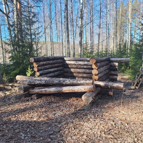 Puurakenteinen Laavu ulkokäyttöön. Rakennuksessa on pulpettikatto bitumikermikatteella ja kaksiosaiset etuovet, jotka avautuvat leveästi. Vaja soveltuu esimerkiksi puiden, työkalujen tai muun pihakaluston säilytykseen. Rakennus on sijoitettu kivijalustalle, mikä helpottaa ilmanvaihtoa ja suojaa puuosia maankosteudelta.