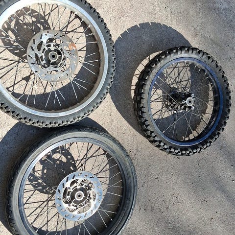 Siitä hyvät chromi enskat. Pari sataa kilsaa ajettu Michelinin sisärengas. Eteen ajamaton rengas mukaan. Etusen laakerit hyvät mutta takaisen kannattaa vaihtaa. Takaa pari pinnaa poikki Sopii Derbi/Gilera/Aprilia ja miksei am6 mopoonki. Rattaat, levyt ja 2 jotain etuenskaa mukaa.