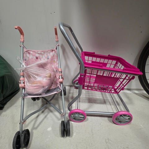 Vaaleanpunaiset ostoskärryt vaikka Barbille. Nämä ovat metalliset ja vankkaa tekoa. Eivät siis mitkään kevyet muovihärpäkkeet.
