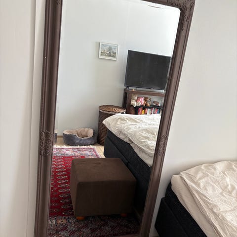 Myydään käsityönä tehty iso koriste peili. Mitat: leveys 60cm ja korkeus 120cm.