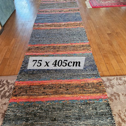 Pitkä monivärinen ja pastellisävyinen räsymatto 100% puuvillaa. Pituus 280 cm, leveys 71. Pientä käytön jälkeä.