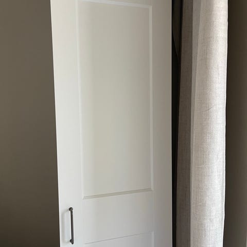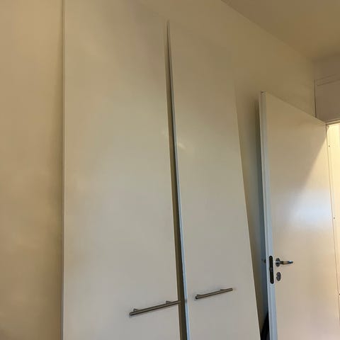Valkoinen Ikean Pax kaappin runko koossa 50x58x236. Mukaan tulee valkoinen matta ovi, musta vedin ja yksi harmaa verkkokori kiskoineen sekä henkaritanko. Kaapin muut sisukset jäävät meille. Ovessa naarmu kahvan kohdalla (kuva) sekä jälki kaapin sivussa (kuva). Muita jälkiä en löytänyt pikaisella tutkimisella.