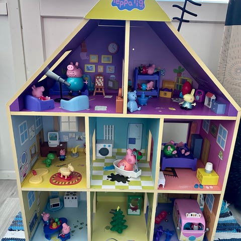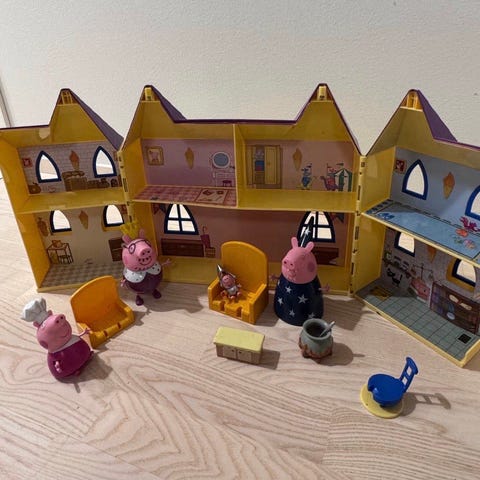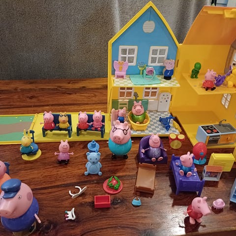 Pipsa Possu leikkitalo hahmoilla. Mukana useita Pipsa Possu -sarjan hahmoja sekä pieniä irto-osia, kuten kalusteita ja leikkipuisto-osio keinuineen ja liukumäkineen sekä perheen auto. Keittiössä seinällä oleva pahvinen roskakori ja kaapisto repeytyneet, mutta talolla leikkinyt ajatteli, että parempi jättää kuin repäistä pois.