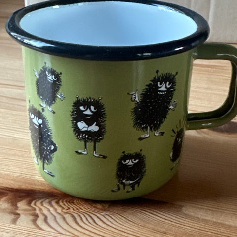 Käytön jälkiä, emalipinnoite kuitenkin ehjä, joten suoraan käytöstä myyntiin, oivallinen retkimuki, käy nuotiolle