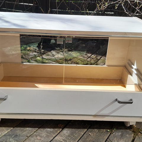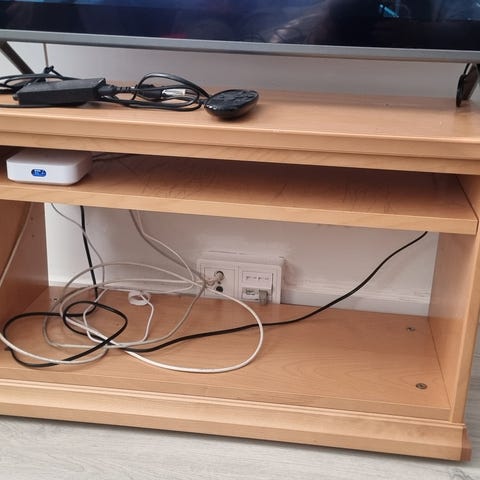 Ruskea tv-taso, jossa useita säilytyslokeroita. Tasossa on vetolaatikoita ja kaappiovi, joissa metallinväriset vetimet. Materiaalina on puuviilupintainen levy. Sopii television ja viihdelaitteiden sijoittamiseen sekä yleiseen säilytykseen olohuoneessa tai makuuhuoneessa.