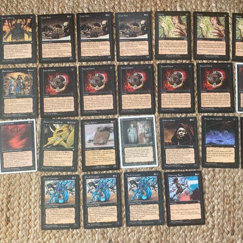 Yhteensä 79 korttia (77 rarea, yksi uncommon ja yksi common). Arvokkaimmista korteista kuvat mukana. Kunto vaihtelee: osa on NM, osassa hiukan enemmän kulumaa ja pelaamisen jälkeä. En myy yksittäisiä vaan myyn kaikki kerralla. Mieluiten nouto, niin voit tarkistaa versiot ja kunnon rauhassa eikä tule niistä sitten epäselvyyttä. Toimitus Helsinkiin mahdollinen tiettyinä ajankohtina.