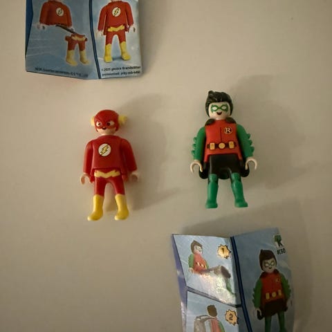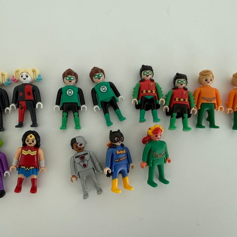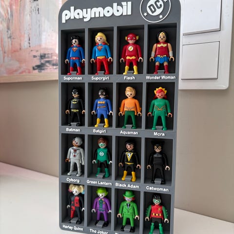 Kuvanmukainen säilytyshylly Kinder Playmobil DC hahmoille. Kuvan hahmot eivät kuulu kauppaan.