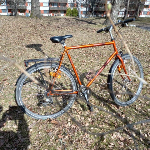 Helkama hybridipyörä miehille. Made in Finland. Runkokoko 56 cm ja 26" renkaat. Pyörässä on etu- ja takalokasuojat sekä tavarateline takana. Rungossa merkintä "Ultra Lite 5000". Sopii arkiajoon ja työmatkoille kaupunki- ja kevyen maastoajon olosuhteisiin. Shimanon vaihteet, säätö- ja huoltotarvetta niihin. Etuvaihtaja toimii hyvin, mutta takana alimpien rattaiden valitseminen ei toimi. Käsijarrut, nousukahvat ja jalkatuki. Alkuperäiseltä omistajalta.