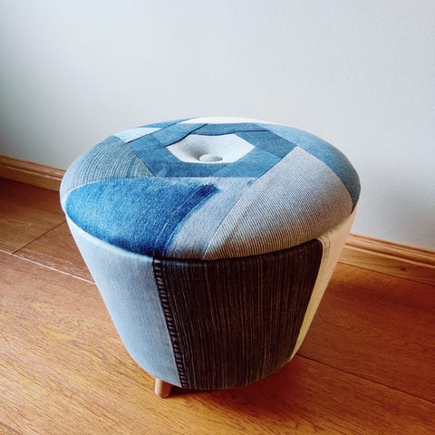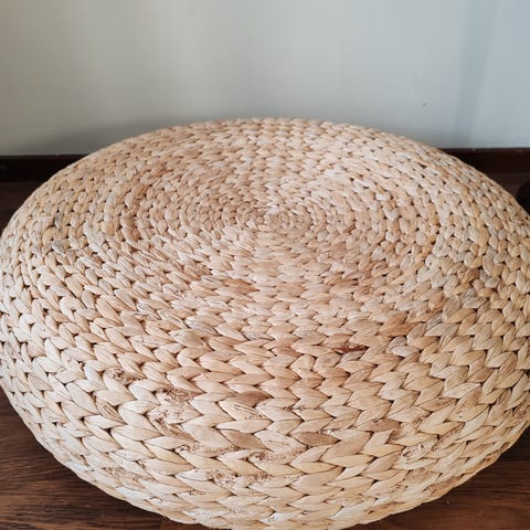 Uudelleen verhoiltu rahi ja samalla kankaalla ommeltu tyyny. rahi tehty perinteisin menetelmin, kierrejouset, meriheinä, ja vanut. Kaikki materiaalit uutena käytetty.