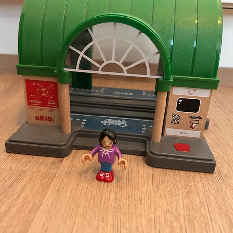 Brio poliisiasema. Poliisiautossa äänet ja valot toimii. Ukkeleissa käytönjälkiä. Muutoin hyväkuntoinen ja vähän leikitty.