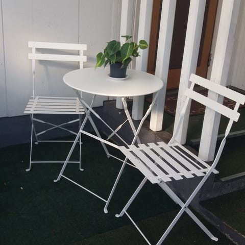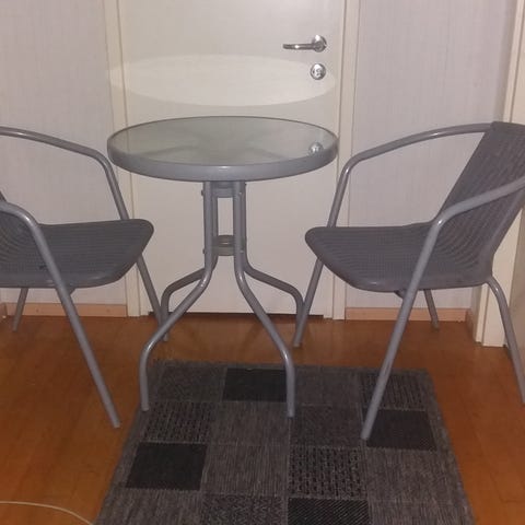 Pöytä ja kolme tuolia. Tuoleissa kulumaan ja paikoin perkaantunu.