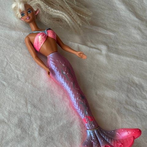 Barbie pikkumerenneito-lelufiguuri ja tarvikkeet. Settiin kuuluu punatukkainen merenneitonukke, vaaleansininen pyrstöosa sekä vaaleanpunaisia ja violetteja muovisia leikkitarvikkeita, kuten simpukan muotoinen alusta ja koristeellinen esine. Sopii lasten leikkeihin ja mielikuvitusleikkeihin sisätiloissa.