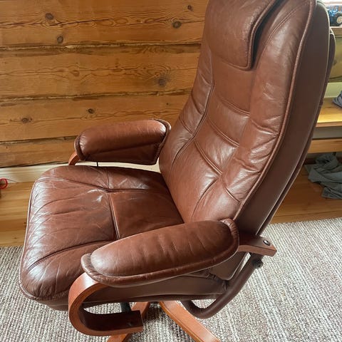 Myydään nahkainen nojatuoli. Mukava istua. Asentoa pystyy säätämään. Käsinojissa ja selän sivussa kulumaa.