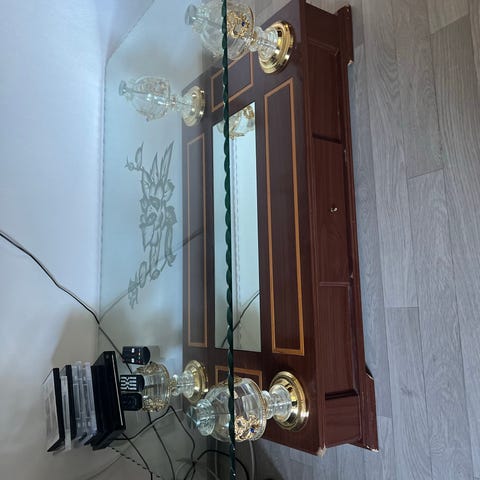 Kirkas lasikansi. Alapuolella on kaksi vaaleaa hyllyä. Pöydän runko on kromattua metallia, hyllyt valkoisia, korkeakiiltoisia.