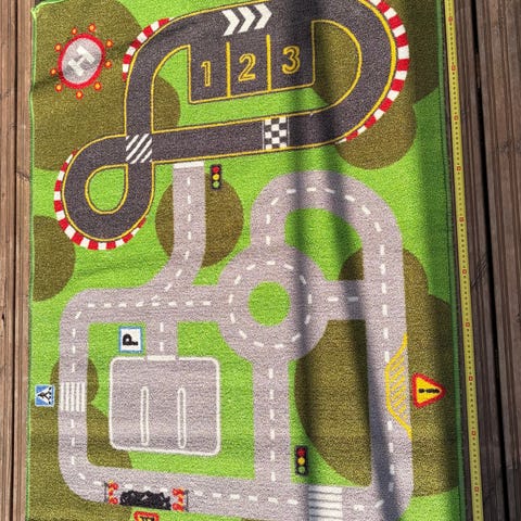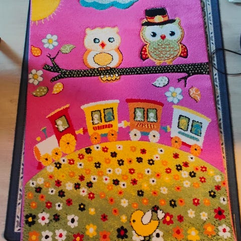 Lasten huoneen matto Muumi-kuviolla. Mitat 120x100cm. Ehjä ja siisti. Sininen tahra muumin niskassa näkyvissä.