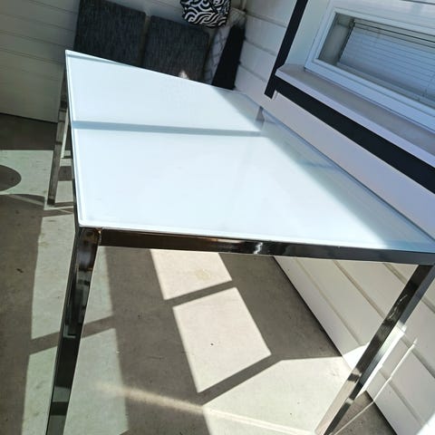 Itse tehty ruokapöytä, koko 73x73, korkeus 75. Lankut irtonaisia lasitason alla. Pöydän runko metallia, lasikansi teetetty mittatilaustyönä.