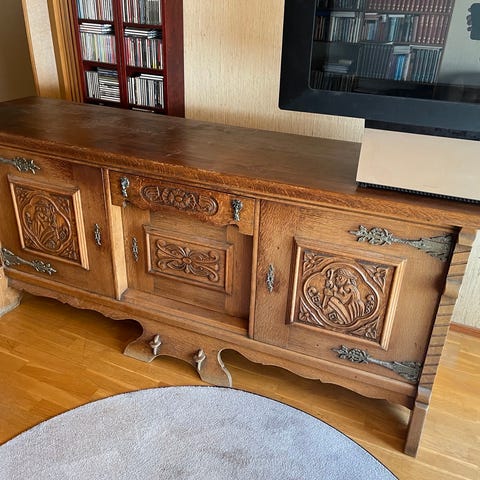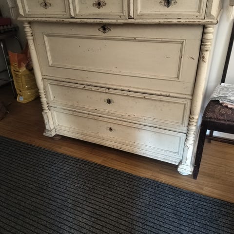 Vanha senkki, mikä kunnostettu pinnaltaan. Siirtämisestä johtuen yksi jalka irronnut liitoksistaan. Alalaatikot vähän jumittaa.