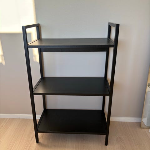 Koko 33.5x50cm ja korkeus 74cm. Siisti ja ehjä. Metallia, tasot tukevaa muovia. Apupöytä säilytys