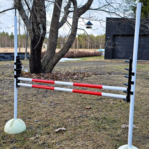 Käyttämätön koiran agility-keppisarja. Sarja sisältää sinisiä ja oransseja keppiä, joissa on metallipiikit maahan kiinnittämistä varten. Tarkoitettu koiran agilityharjoitteluun ja koiran liikunnan ja aktivoinnin monipuolistamiseen pihalla tai muulla sopivalla alustalla.