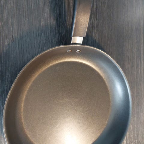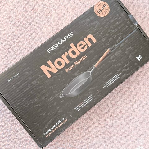 Fiskars Brasserie paistinpannu, jossa valurautainen paisto-osa ja puinen kahva. Pannussa on lisäksi pieni apukahva vastakkaisella puolella helpottamassa nostamista.