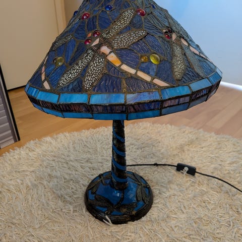 Myydään kuvienmukainen Tiffany-tyylinen pöytävalaisin. Kuvun halkaisija n. 36 cm ja valaisimen korkeus n. 58 cm. Myynnissä myös samanlainen kattovalaisin.