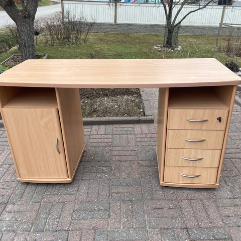 Kirjoituspöytä vaaleaa puuta, vankka koivuinen. Pöydässä on leveä suorakaiteen muotoinen taso ja alla molemmissa päissä säilytystilaa. Toisessa päässä on useita vetolaatikoita ja toisessa päässä kaappi ovella. Vetimet ovat puumateriaalia ja sointuvat pöydän sävyyn. Sopii työpöydäksi kotiin tai toimistoon ja tarjoaa runsaasti säilytystilaa papereille ja tarvikkeille.