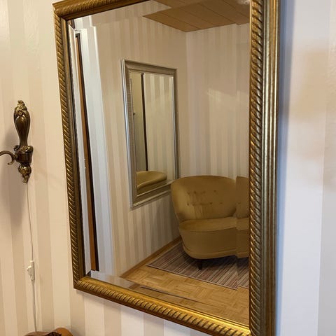 Myydään siistikuntoinen seinäpeili / sisustuspeili. Leveys 63,5cm, korkeus 73,5cm, syvyys n. 3cm. Peilipinnan koko 48,5x58,5cm. Kolmannessa kuvassa näkyy peilin väritys aika hyvin, vaihteleva tummanruskea ja kulta. Takana kiinnikkeet.