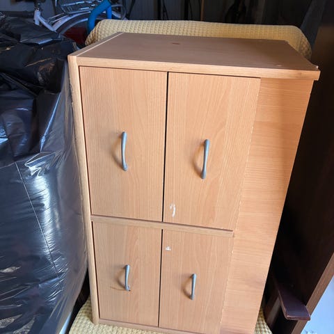 Kolmitasoinen kaappi liukuovilla ja avohyllyillä. Tummapintainen puu, sisäosat valkoiset. Sisältää lasihyllyn, joka jakaa säilytystilan. Esimerkiksi sopii säilytyskalusteeksi ja tasoksi olohuoneeseen tai työtilaan.