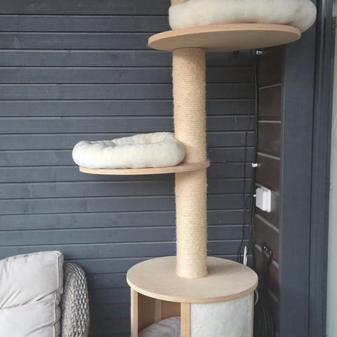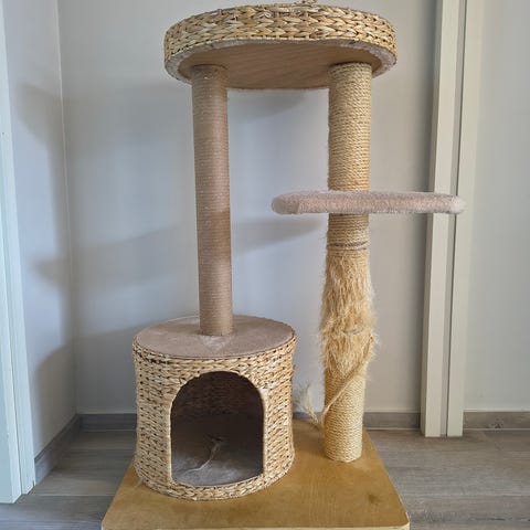 Kissan kiipeilypuu, jossa on pehmustettu, reunallinen makuupaikka ylhäällä ja raapimisalusta tolpassa. Pohjassa on tukeva alusta, joka pitää tornin paikoillaan. Kiipeilypuu sopii kissan lepoon, kiipeilyyn ja kynsien huoltoon sisäkäytössä. Beige kangas ja narupäällysteinen raapimispinta.korkeus70cm.