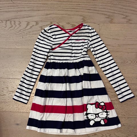 Ihana kissa-aiheinen mekko, suomalaista käsityötä (ostettu markkinoilta). Kokolappua ei ole, mutta meillä ollut käytössä n. 128-130 kokoisella tytöllä. Vain nouto.