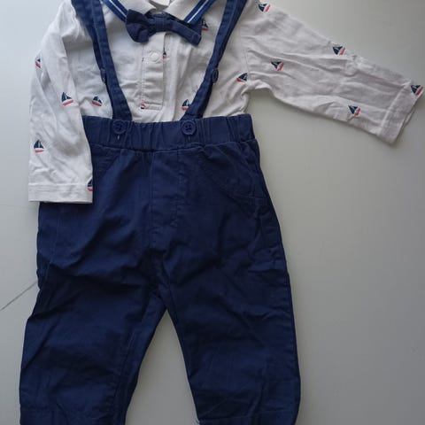 Hyväkuntoinen juhlava asu vauvalle. Puuvillaiset kauluspaitabody rusetilla ja samaan settiin kuuluvat tummansiniset housut. Käytetty yhden kerran. Pesty hajuustettomasti. Savuton ja lemmikitön koti.