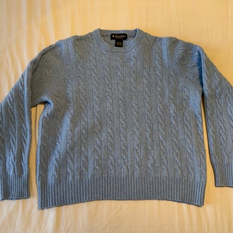 Myyntiin ehjä ja siistikuntoinen Brooks Brothers -merkkinen tummansininen neule 1/4 vetoketjukauluksella. Kokolappuun on merkitty L, mutta paita on kutistunut hieman ja vastaa noin M-L-kokoa. Kangas on 100% paksua ja laadukasta merinovillaa, merkin vintagelaatua. Olkapäässä on pieni samanvärisellä langalla tehty paikkaus, joka näkyy kuvissa.