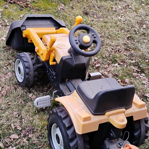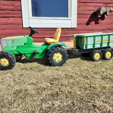 Poljettava John Deere lastentraktori, jossa on etukuormaaja ja irrotettava peräkärry. Tarrat kuluneet.