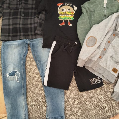 Poikien vaatepaketti, koko 134-140. Pakettiin kuuluu useita vaatteita: lyhythihainen ruudullinen kauluspaita, pitkähihaisia kauluspaitoja sekä farkut. Vaatteet ovat väritykseltään kirjavia, joukossa muun muassa sinisen ja vaaleiden sävyjä. Soveltuu noin 134 cm pituiselle pojalle arki- ja juhlakäyttöön vuodenajasta riippuen yhdistelystä riippuen.