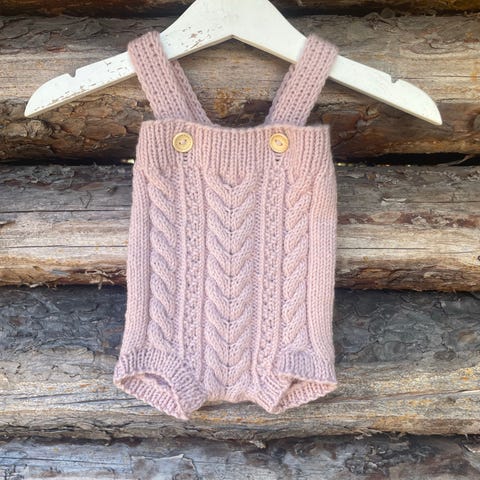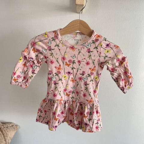 Jonkun itse tekemä ihana vaaleanpunainen romper frillaolkaimilla, kerran ollut päällä. Edessä pieni langanveto, muuten oikein siisti vielä. Olkaimia saa säädettyä kahteen eri kohtaan eli menee jo 50 koossa hyvin. :)